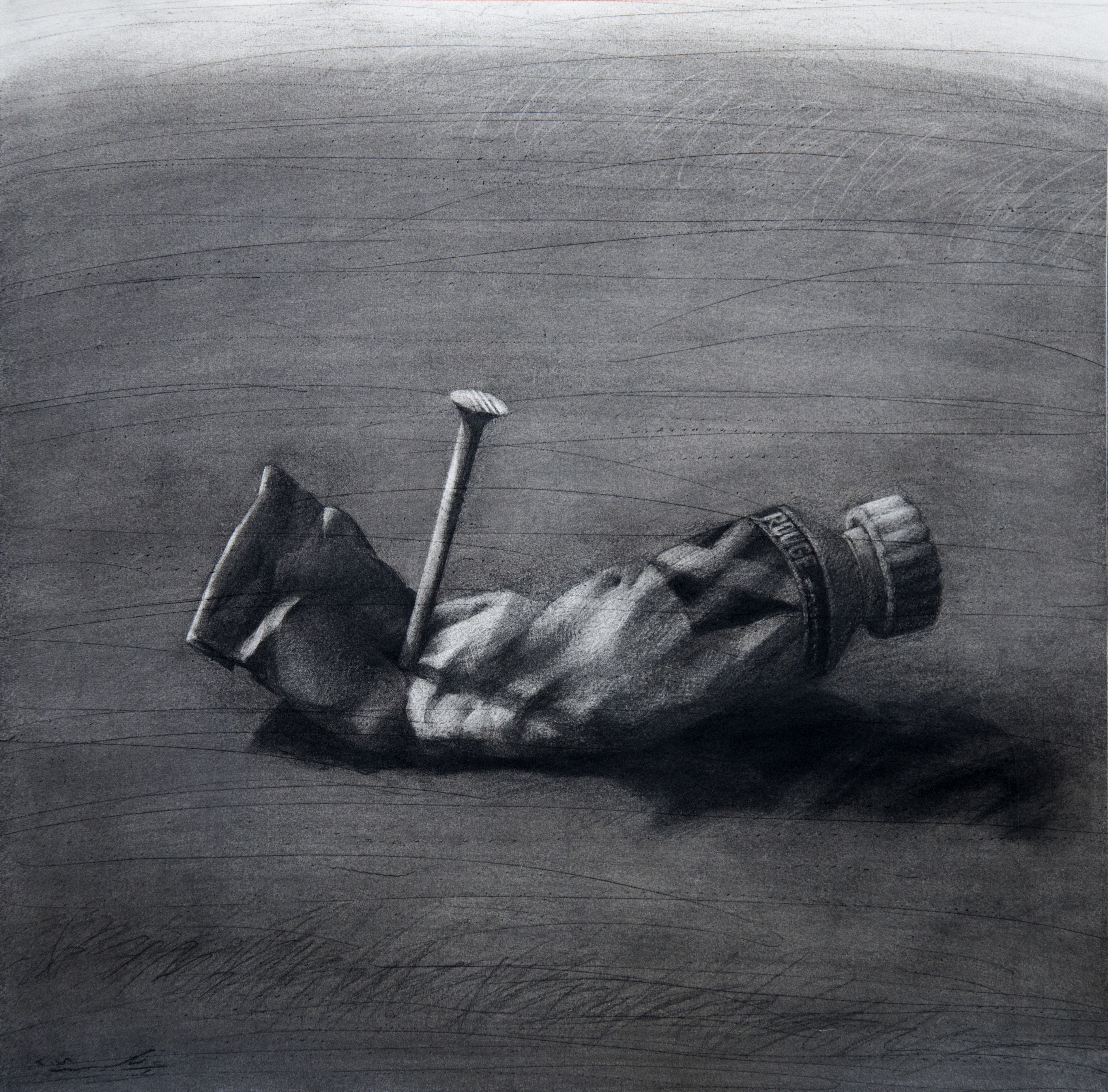 في هذا الفصل من أعماله، يقدّم عبدلكي لوحةً جداريةً مثيرة. عملٌ يمثّل يداً، مشدودة القبضة، مبتورةً من منتصف الساعد بعناية، وموضوعة بعناية أيضاً على مسطّح مستطيل. في الخلفيّة مساحةٌ داكنةٌ تسدّ الأفق وتَسري عليها خطوطٌ أفقية متوازية. تُسهم هذه الخلفية، بفعل الخطوط الموازية تحديداً، في حصر التوتر والقوة المضغوطة بين القبضة والساعد.