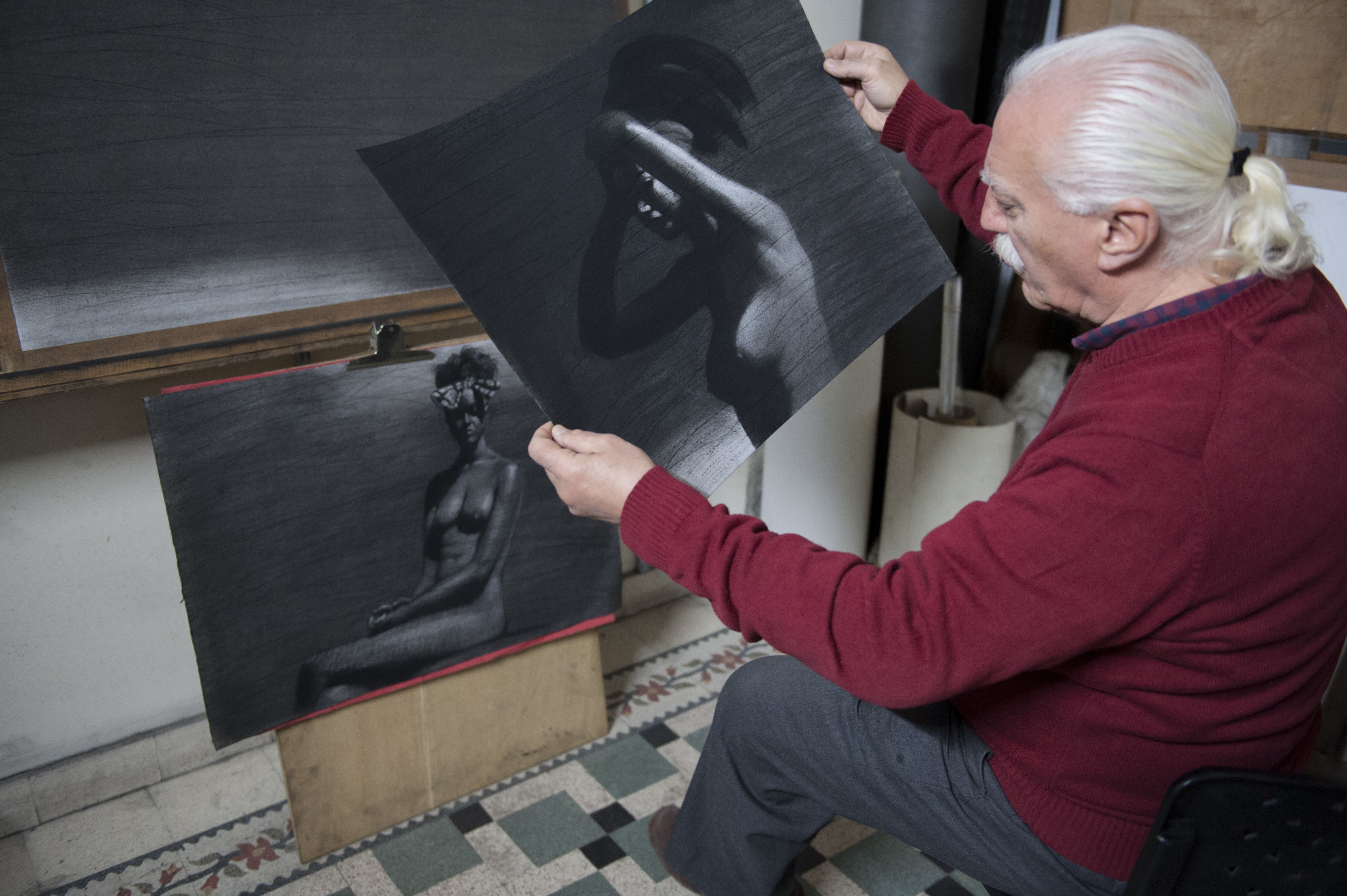 في "نصف ساعة أخرى" من موعدٍ آخر، سوف يكشف عبد لكي عن مفاجأة ثانية. يقول: "منذ سنوات، وأنا أفتّش عن موديل عارٍ، من دون جدوى، فنحن جيل درس الفنون من دون أن يحظى بموديل محترف، بعد أن منعت كلية الفنون الجميلة في دمشق، في سبعينيات القرن المنصرم، وجود مثل هذا الموديل. بعد بحثٍ مضنٍ، وافقت أحداهن أن تتكفّل هذه المهمة، فأنجزتُ نحو عشرة أعمال بقلم الفحم". بين جدارية السمكة على الجدار، وعارية يوسف عبدلكي، سوف نقارن تلقائياً بين اختناق السمكة شنقاً بالحبال الثقيلة، وتفتّح جسد أنثوي بشهوة الحياة، وقدرة هذا الغرافيكي الصارم على اجتراح مساحة للحياة وسط الجحيم وحطام كائناته ووجوه المفقودين.
