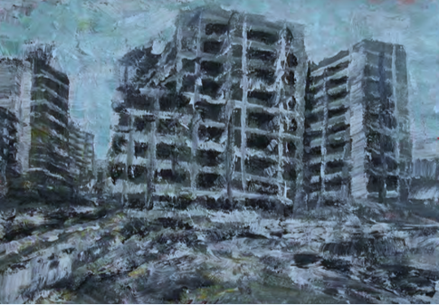 عبر اختطافٍ مفارقٍ وساخر لشعار رينيه ماغريت، من أجل قول "هذه بيروت"، تُقَدَّم الأخيرة على أنها الصورة السلبية لسويسرا، فتكثّف عبارة "Ceci n’est pas la Suisse"يوجد في أعمال أيمن بعلبكي تأمّل لمشهد المدينة سابق لتمثيلات 2008، ويضرب جذوره في حياته الخاصة: بمجرد وصول عائلته النازحة إلى بيروت، استقرت العائلة في بيئاتٍ مدينيةٍ مختلفة. تستقي لوحات بعلبكي وجودها من حياةٍ كان فيها الاهتمام بالبناء مرادفاً للإقامة والاستقرار المكاني. وفي الواقع، تخون لوحاته المبكرة هذا الاهتمام بفضاء المدينة. رسم بعلبكي قبل عام 2008 عدداً من المشاهد المدينية (8) التي قد تظهر مختلفة عن تلك اللاحقة من خلال التعبير اللوني عن الطاقة الحيوية؛ ولكن مع ذلك، يمكن للمرء أن يلحظ رؤية الشواش، بل ونزعة مدينية ملخبطة ما بعد قياميّة وعالم مبعثر، من خلال خلفيات فضاء إنساني سيُهجر لاحقاً وتُنزع إنسانيته، وحيث يظهر في تركيب اللوحة ذلك الإيقاع ذاته الذي سيشهد لاحقاً اشتداداً في خط الانهيار المنكسر. ٢ـ المدينة الأسطورية بتأثيرٍ من بابل (9) من دون شك - ذلك العمل الذي يبدو أنه استبق سلسلة تموز التي فتحت الطريق أمام بعدٍ أسطوري - يغدو المشهد في اللوحات أمثولياً (أليغورياً). بابل تعبير عن إرادة الارتقاء إلى الله. وفي هذا هي تصبح رمزاً للإثم والعقاب. تصبح الفوضى في بابل، حيث لا يسمع الناس بعضهم الآخر كونهم لم يعودوا يتحدثون اللغة ذاتها، عقاباً على خطيئة جمعية يرتكبها مجتمعٌ ميّالٌ للتفرّق. وكما هي الحال في سردياتٍ توراتية أخرى، فإنَّ المدينة التي تُرى تقليدياً على أنّها تعبير عن النظام الكوني ومفعمة برمزية المركز (تلك الرمزية التي يمكن أن نجدها في الإشارة إلى "وسط المدينة") تصبح هنا استعارة للشر الجمعي. وبهذا المعنى، فإن أسطورة بابل هي أسطورة مدينية على نحو عميق. وثمة مغزى هام لحقيقة أنها تأتي في نهاية إصحاحات خلق البشر في "سفر التكوين (11، 1-9)" وتسبق السرد الإخباري المتسلسل والمفصَّل في أسفار آباء التوراة. إنها تترجم العبور من الأسطورة إلى التاريخ وتنفتح على بعد الزمن. وبهذا، لا يكون بلا معنى أنّ كارثة اجتماعية تقلب التاريخ البشري من فترته التأسيسية إلى فترة صيرورته الأوسع. [caption id="attachment_901" align="aligncenter" width="400"]